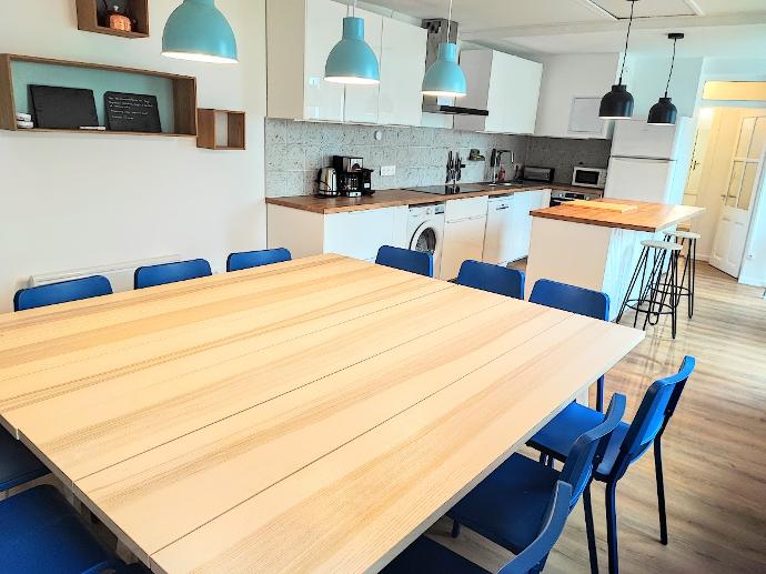 Il se compose de 7 chambres avec des lits simples et doubles pour une capacité d'accueil pouvant aller jusqu'à 15 couchages. Vous apprécierez sa vaste cuisine, son jardin indépendant et son grand salon annexe où nous ferons nos répétitions quotidiennes.
